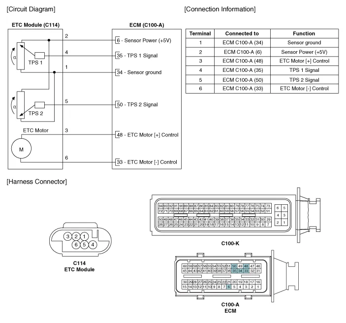 InspectionThrottle Position Sensor (TPS)1.Connect the GDS on the Data Link Connector (DLC).2.Start the engine and measure the output voltage of TPS 1 and 2 at C.