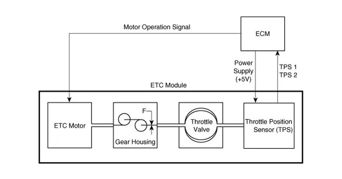 Fail-Safe Mode Item Fail-Safe ETC MotorThrottle valve stuck at 7°TPSTPS 1 faultReplace it with TPS 2TPS 2 faultReplace it with TPS 1TPS 1, 2 faultThrottle Angle (°) Throttle valve stuck at 7°Duty (%)• TPS1 : 13.