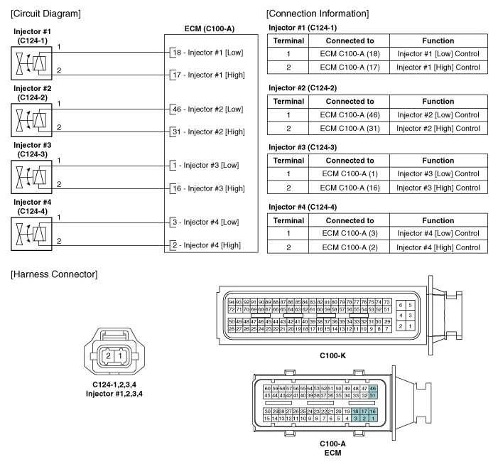 Inspection1.Turn the ignition switch OFF.2.Disconnect the injector connector.3.Measure resistance between the injector terminals 1 and 2.4.Check that the resistance is within the specification.