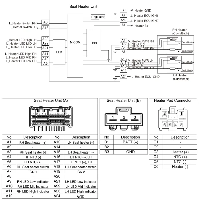 Component Location[Front Seat Heater (Non-Air ventilation)]1. Seat heater unit (Passenger seat only)2. Seat chusion heater3. Seat back (Heater)[Front Seat Heater (Air ventilation)]1.