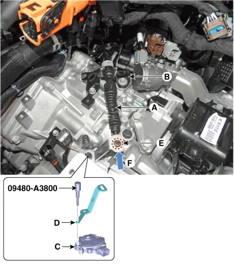 | 5. | Lightly tighten the nut (E) after connected the shift cable (B) in the manual control lever. |