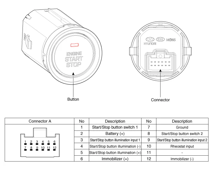 Removal1.Disconnect the negative(-) battery terminal.2.Remove the crash ped lower panel.(Refer to Body - "Crash Ped Lower Panel")3.Remove the start/stop button (B) after disconnect the connector (A).