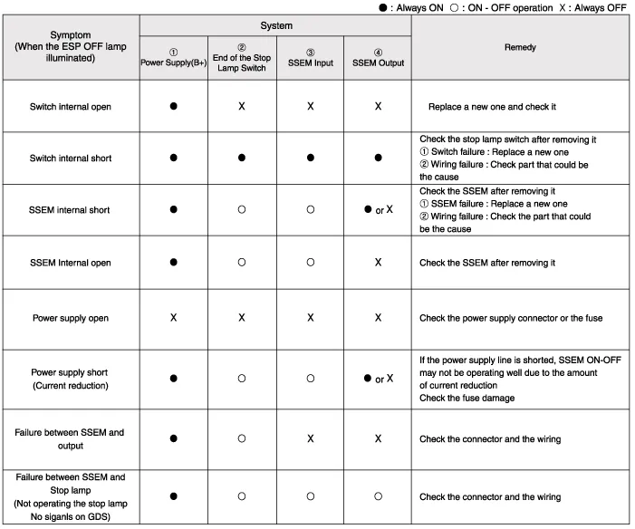| Symptom : Shifting gear trouble, Starting failure, Cruise control function cancelation trouble, EPB function cancelation trouble, Stop lamp lighting trouble , ESP OFF light illuminated. |