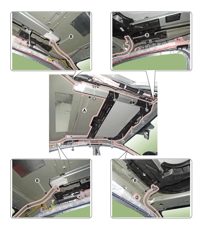 | 6. | After loosening the mounding nuts and bolts, remove the sunroof assembly (A).