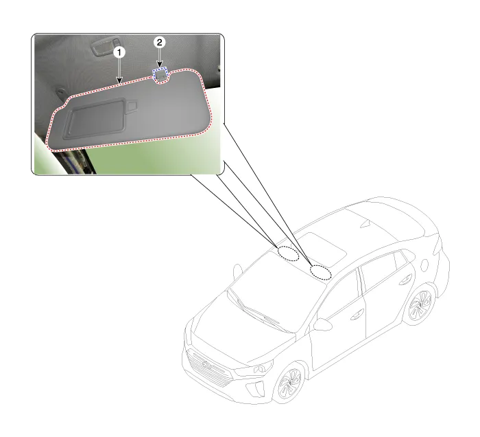 Components (1)[General Type]1. Sunvisor [LH] 2. Sunvisor [RH] 3. Assist handle4. Roof trimComponents (2)[Sunroof Type]1. Sunvisor [LH] 2. Sunvisor [RH] 3.