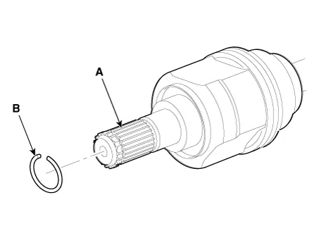 | 2. | Remove the housing circlip (B) from the driveshaft spline (A).