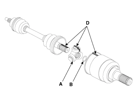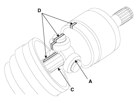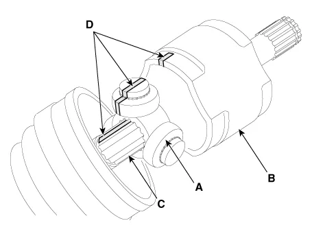 | 2. | Using the alignment marks (D) made during disassembly as a guide, install the spider assembly (A) and snap ring (B) on the driveshaft splines (C).