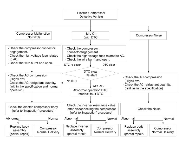 Inspection[Electric A/C Compressor body inside inspection]1.Electric compressor body inside check procedure.1)Remove the low-pressure pipe from the electric compressor.