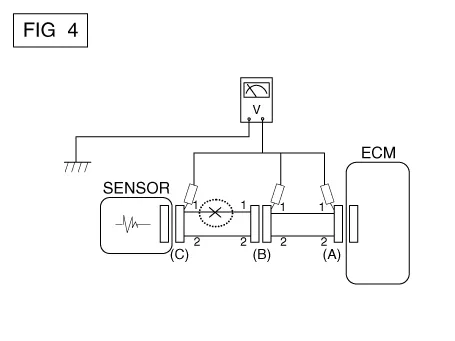 | 3. | Voltage Check Method | a. | With each connector still connected, measure the voltage between the chassis ground and terminal 1 of each connectors (A), (B) and (C) as shown in [FIG. 4]. The measured voltage of each connector is 5V, 5V and 0V respectively. So the open circuit is between connector (C) and (B).