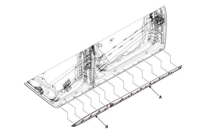| 2. | Using a screwdriver or remover, remove the rear waist line molding (B).