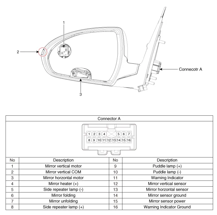 | 1. Warning Indicator 2. Side repeater lamp | 3. Puddle lamp |
