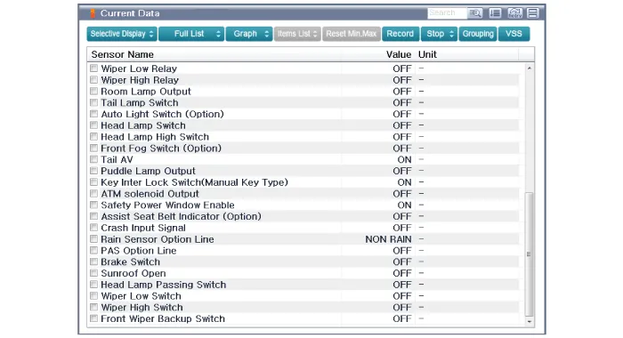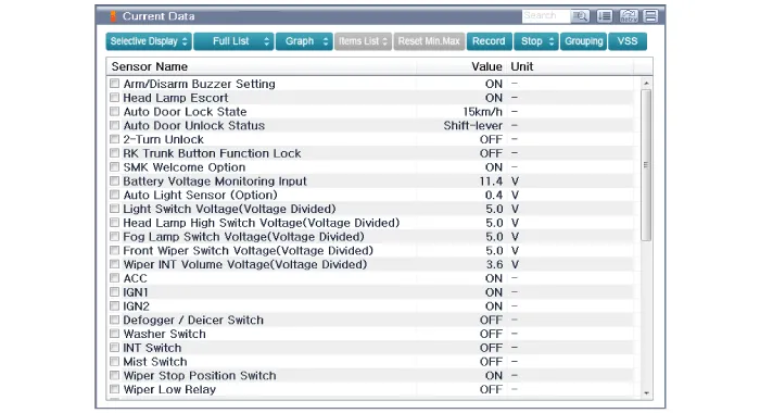 | 5. | Select the "Current Data" menu to search the current state of the input/output data. The input/output data for the sensors corresponding to the Body Control Module (BCM) can be checked.