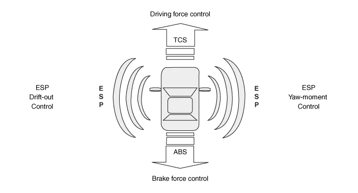 ESP adds a further function known as Active Yaw Control (AYC) to the ABS, TCS, EBD and ESP functions. Whereas the ABS/TCS function controls wheel slip during braking and acceleration and, thus, mainly intervenes in the longitudinal dynamics of the vehicle, active yaw control stabilizes the vehicle about its vertical axis.