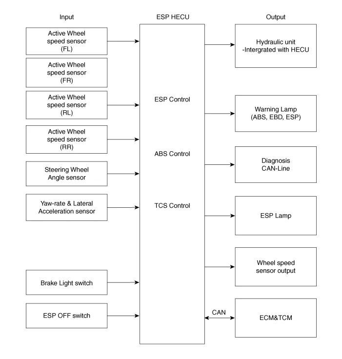 ABS/EBD function : The ECU changes the active sensor signal (current shift) coming from the four wheel sensors to the square waveform.By using the input of above signals, the ECU calculates the vehicle speed and the acceleration & deceleration of the four wheels.And, the ECU judges whether the ABS/EBD should be actuated or not.